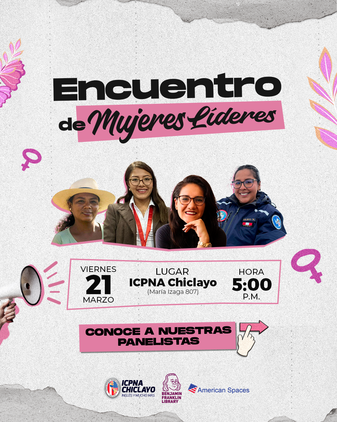 Únete a este encuentro donde podrás aprender, dialogar e inspirarte mujeres líderes lambayecanas que están liderando proyectos e iniciativas en los campos de la ciencia, política, emprendimiento y cultura. 📅 Fecha: Viernes 21 de Marzo. 🕐 Hora: 5:00 p. m. 📍 Lugar: Auditorio del ICPNA Chiclayo. ✨ INGRESO LIBRE