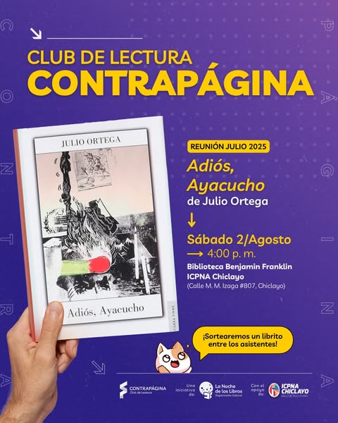 El club donde los libros nos hacen libres 🤘 ¡Hola lectores! 🤩 Este mes, en nuestro club de lectura Contrapágina leeremos y conversaremos sobre 📕📘 “Adiós, Ayacucho” de Julio Ortega 📘📕 ¿Cuándo? ¿Cómo? ¿Dónde? 😱 🔸 El sábado 2 de agosto. 🔸 A las 4:00 p.m. 🔸 En la biblioteca del ICPNA Chiclayo. Para participar de la reunión, regístrate ingresando […]