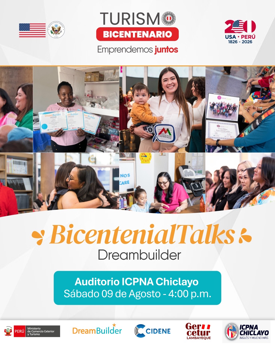 ¡Emprender también es celebrar! 🇺🇸🇵🇪✨ Te invitamos a vivir una jornada llena de inspiración y aprendizaje en las BicentennialTalks Dreambuilder 💡👩‍💼💬 📍 Auditorio ICPNA Chiclayo 📅 Sábado 09 de agosto 🕓 4:00 p.m. 🙌 Conoce historias reales de mujeres emprendedoras que están transformando el turismo y sus comunidades 💪💼 ¡No te lo pierdas! 🌟
