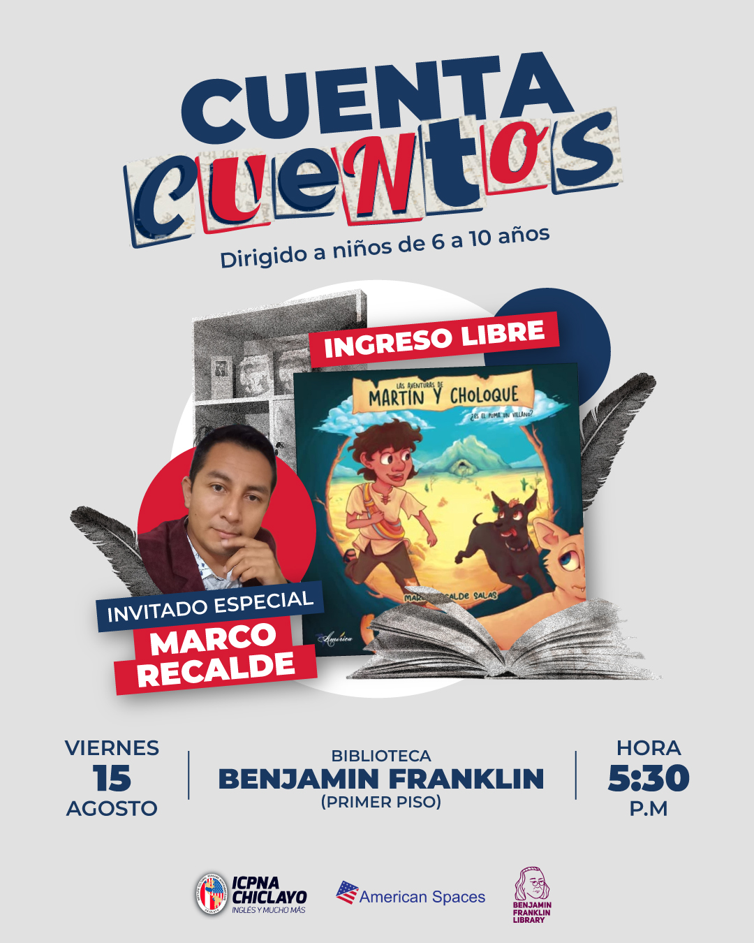 📢 Sesión de cuentacuentos con el escritor Marco Recalde dirigido a niños de 6 a 10 años. 📖 📅 Fecha: Viernes 15 de agosto. 🕔 Hora: 5:30 p.m. 📍 Lugar: Biblioteca Benjamin Franklin – ICPNA Chiclayo. 🆓 INGRESO LIBRE 🆓